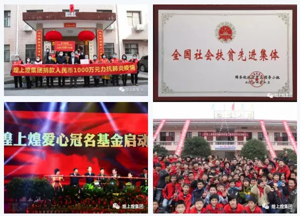 煌上煌致富思源,熱心公益慈善事業(yè),積極承擔社會責任。累計帶動下崗員工1萬余人就業(yè);在全省捐建6所希望學校;帶動農戶3萬余戶,累計增收3億元;2020年新冠疫情發(fā)生后,第一時間向省紅十字會捐款1000萬元用于抗擊疫情,同時總共分四批次向湖北捐贈產品2萬余份,另有口罩、真真老老產品等醫(yī)用物資,總計折合人民幣200多萬元。數(shù)年來為抗洪抗震救災、扶貧修橋修路、資助失學兒童,興辦希望小學等,累計捐款捐物達8000多萬元,被國務院扶貧開發(fā)領導小組評為“全國社會扶貧先進集體”。并于2013年成立了煌上煌愛心基金會,標志著煌上煌向愛心事業(yè)代代相傳進行到底。