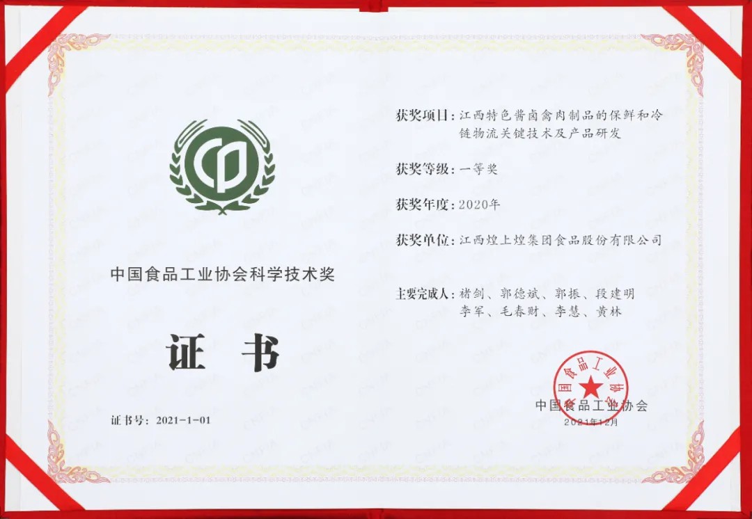 創(chuàng)新引領(lǐng) | 煌上煌斬獲中國(guó)食品工業(yè)協(xié)會(huì)科學(xué)技術(shù)獎(jiǎng)一等獎(jiǎng)