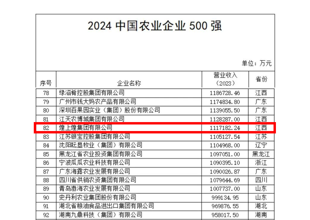 12月11日,農(nóng)民日報社發(fā)布2024中國農(nóng)業(yè)企業(yè)500強榜單。榜單聚集發(fā)布糧油、畜牧、奶業(yè)、水產(chǎn)、食品、流通、農(nóng)資等領域頭部企業(yè),煌上煌集團...